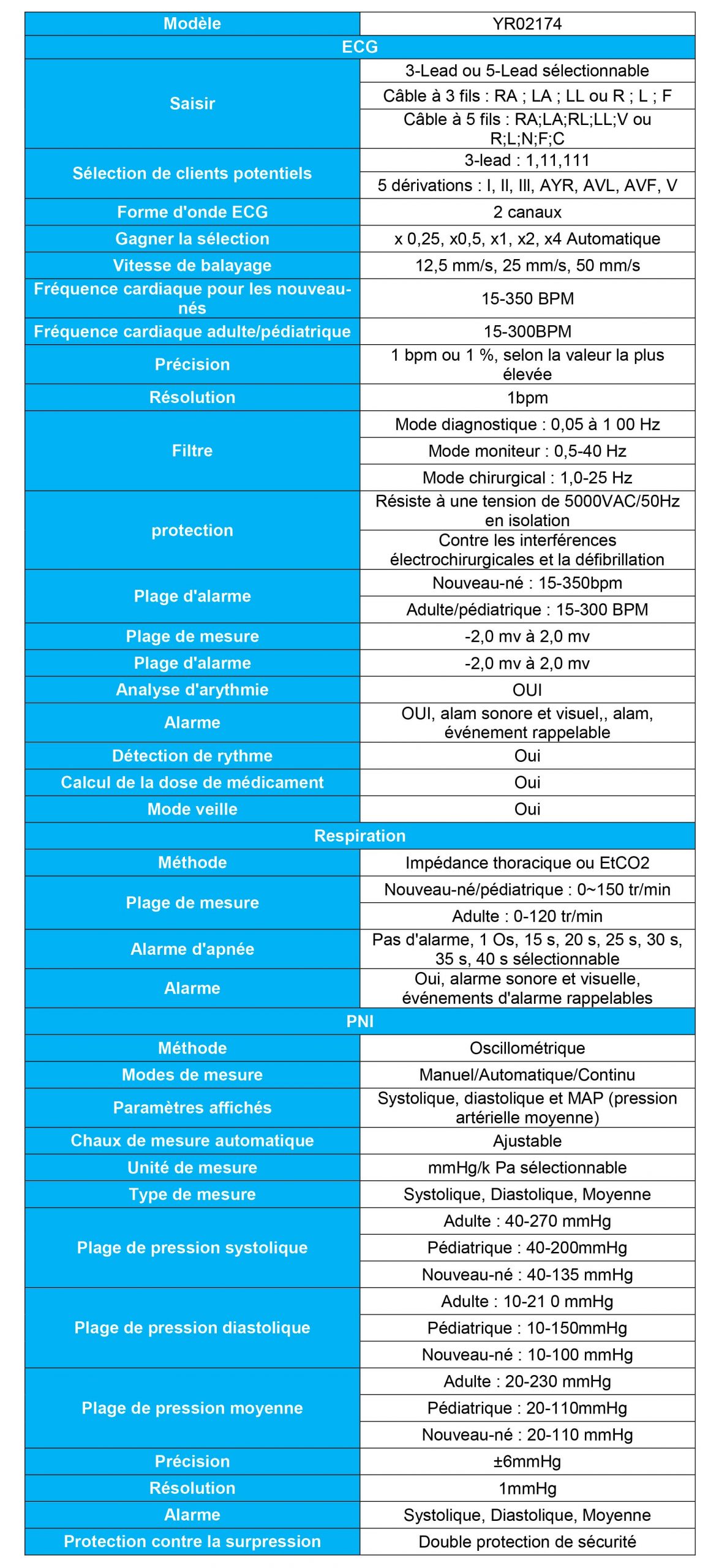 | Taux de resp. Taux de réponse | Adulte : 2~120BrPM | ||||||